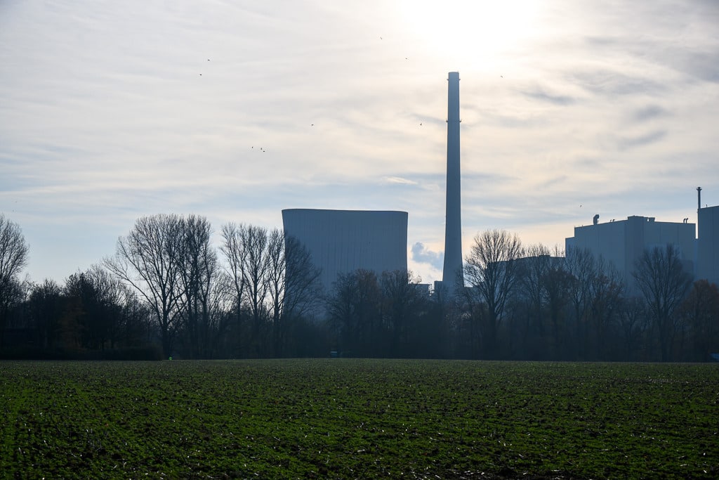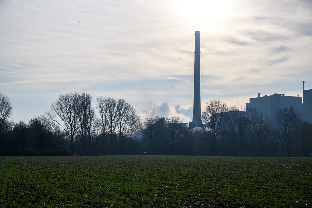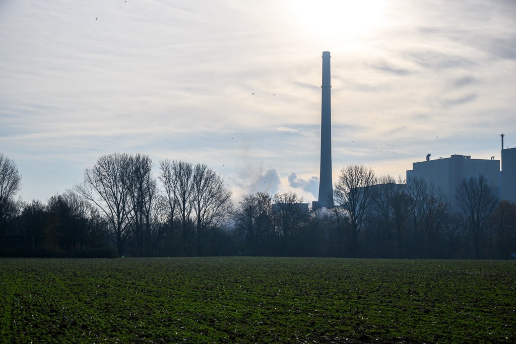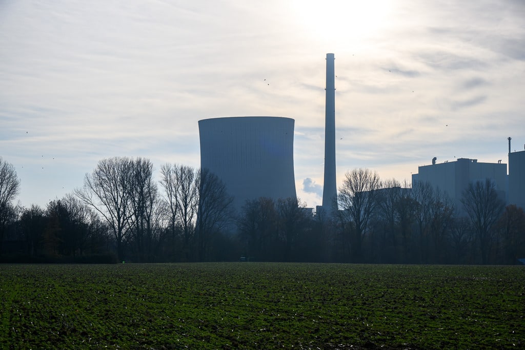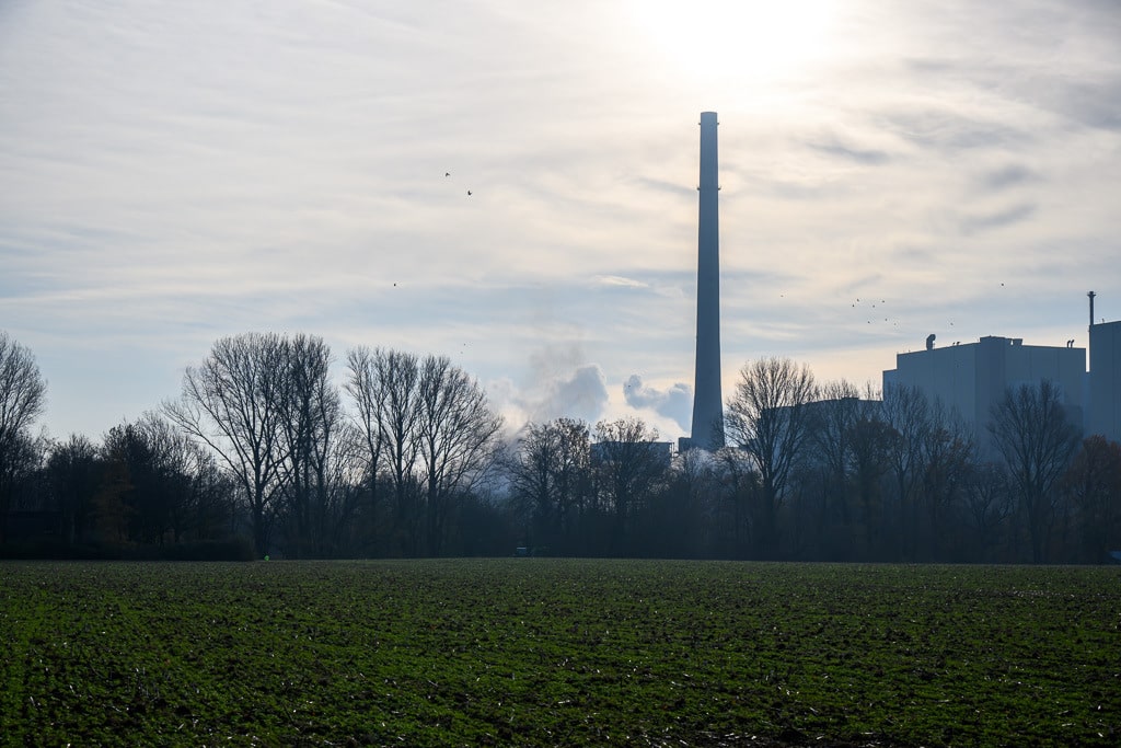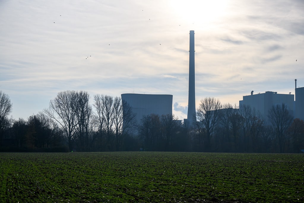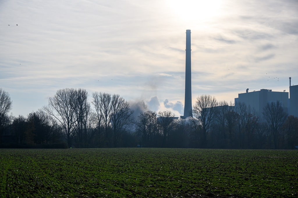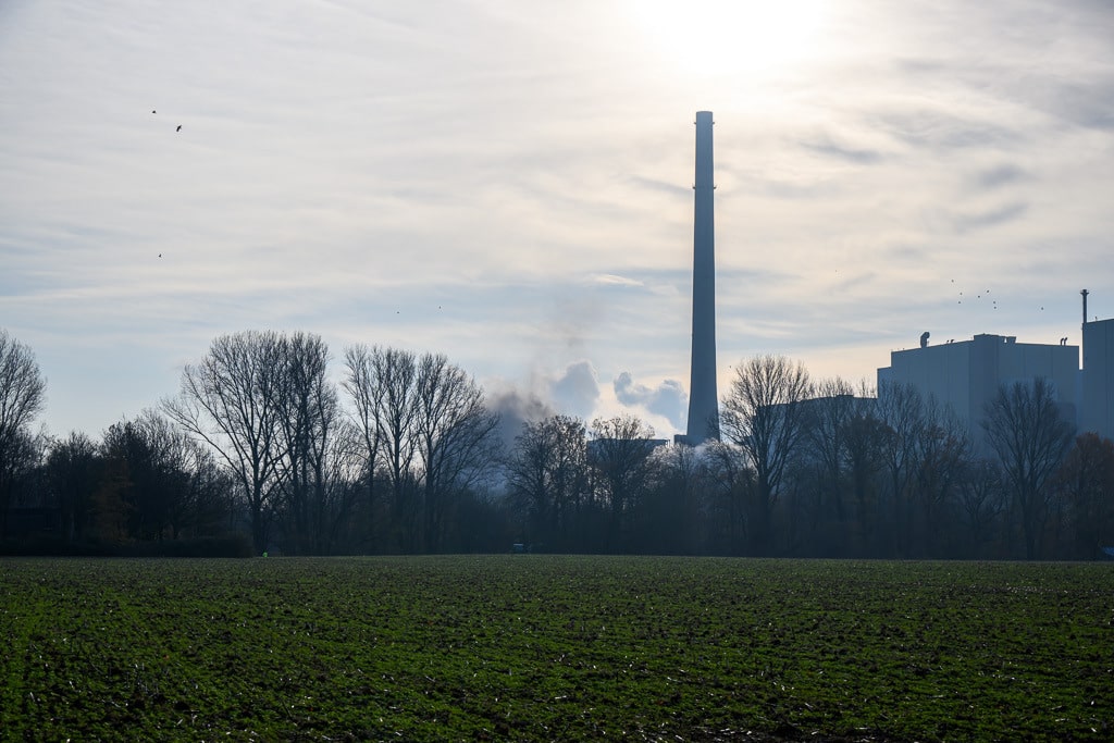 Kurz nach 9 Uhr erreichen wir den Parkplatz Strandhaus Ahr gegenüber dem namengebenden Strandhaus Ahr. Der Übergang von der Frankfurter Straße zur Ahrstrasse ist nicht gesperrt. Der Parkplatz ist so früh noch so gut wie leer. Wir begeben uns zu Fuß zurück zur Frankfurter Straße weiter zur Straße In den Eichen. Von dort haben wir geplant die Sprengung des Kühlturms im Kraftwerk Voerde zu dokumentieren. Als wir dort eintreffen ist nur ein Team vom WDR mit Kamera und Drohne schon vor Ort. Es herrscht fast so etwas wie Götterdämmerung.