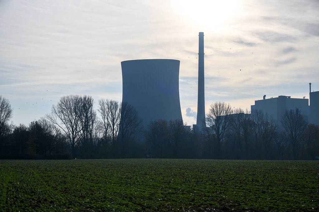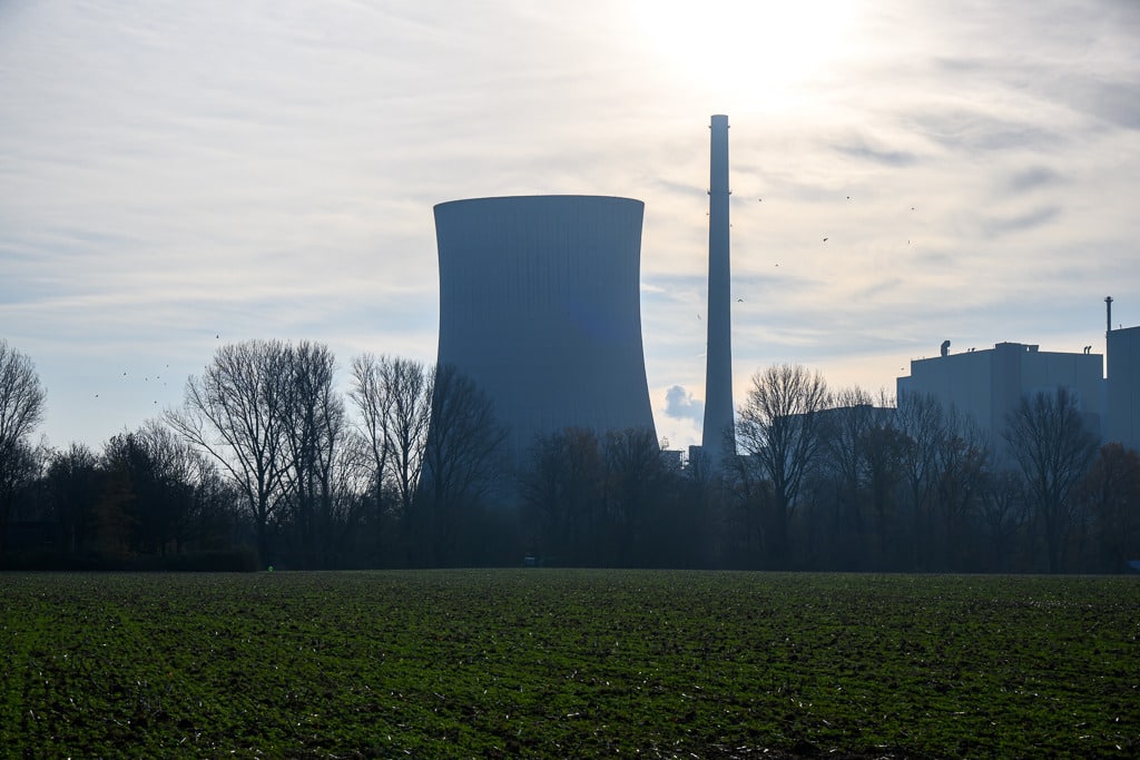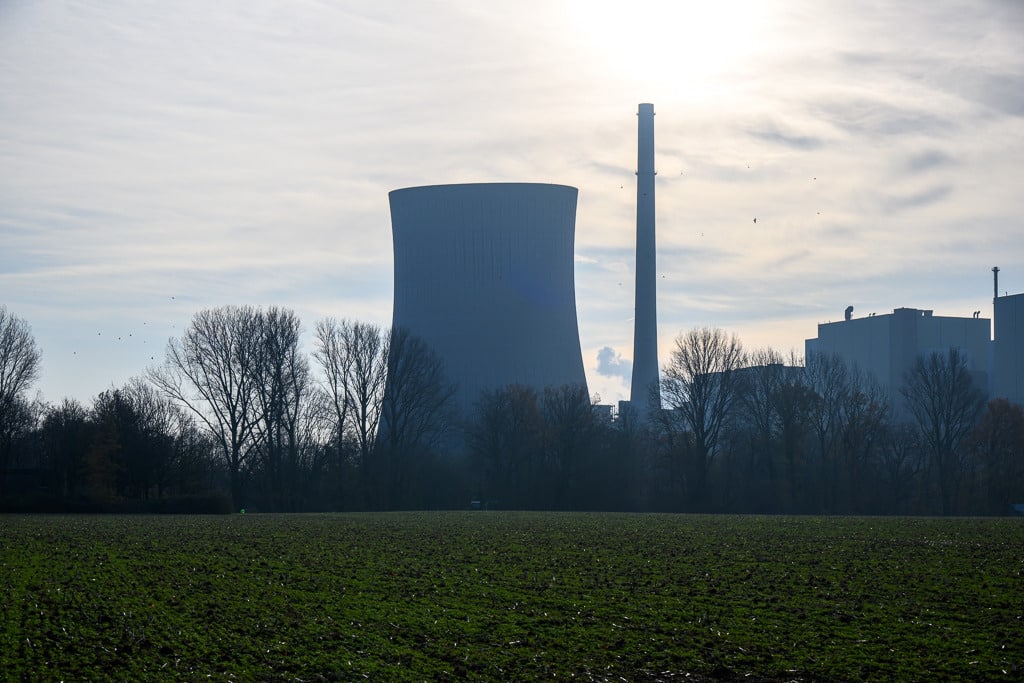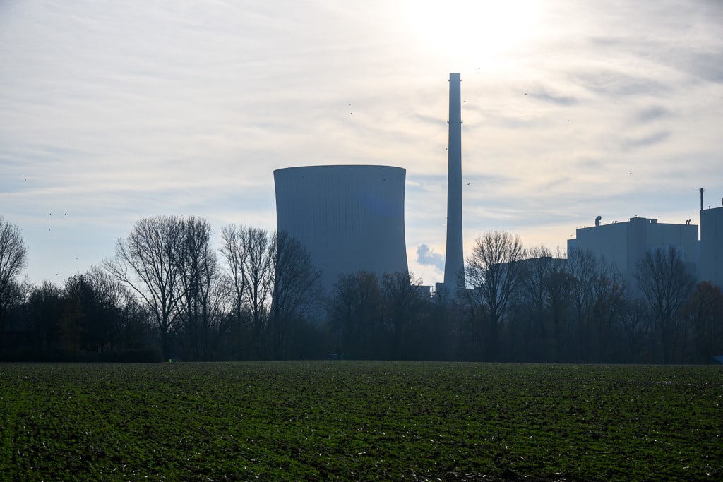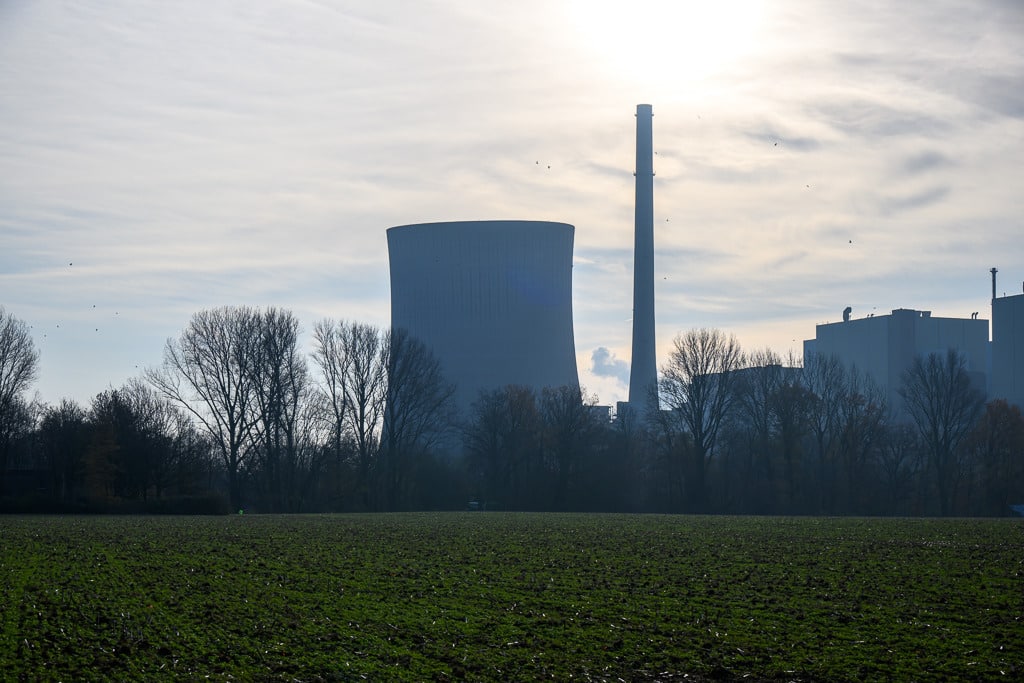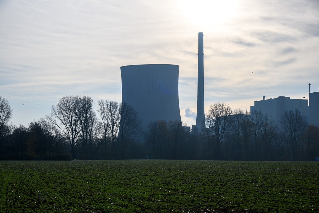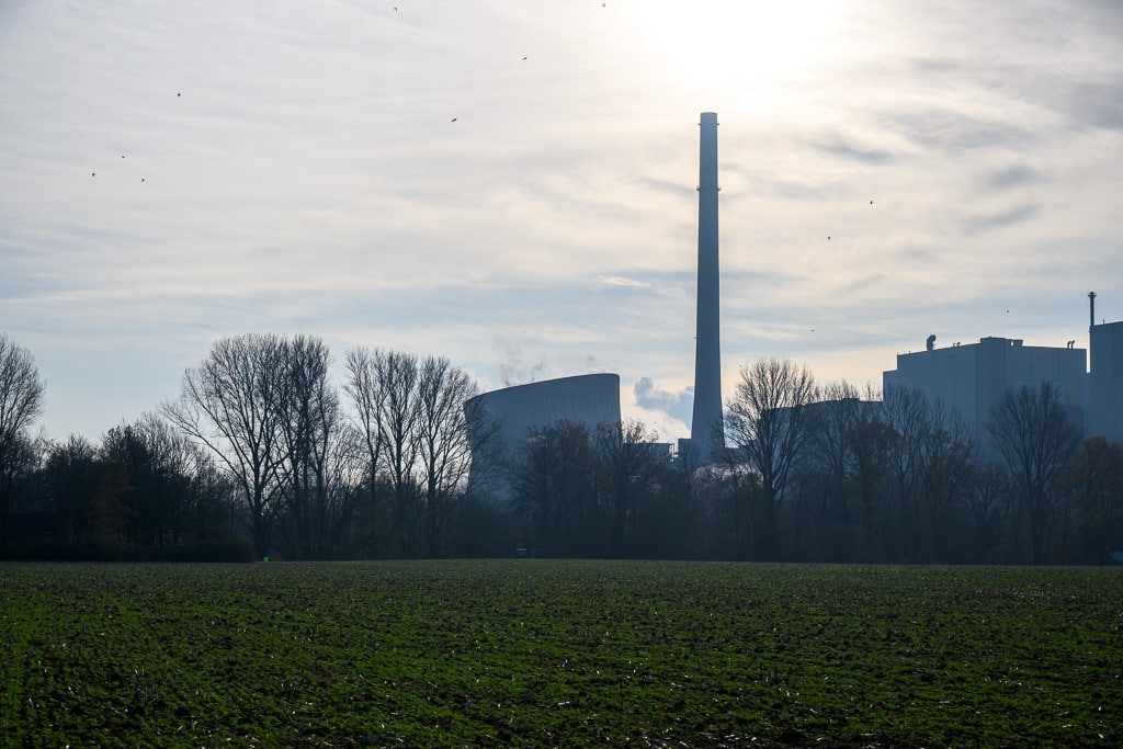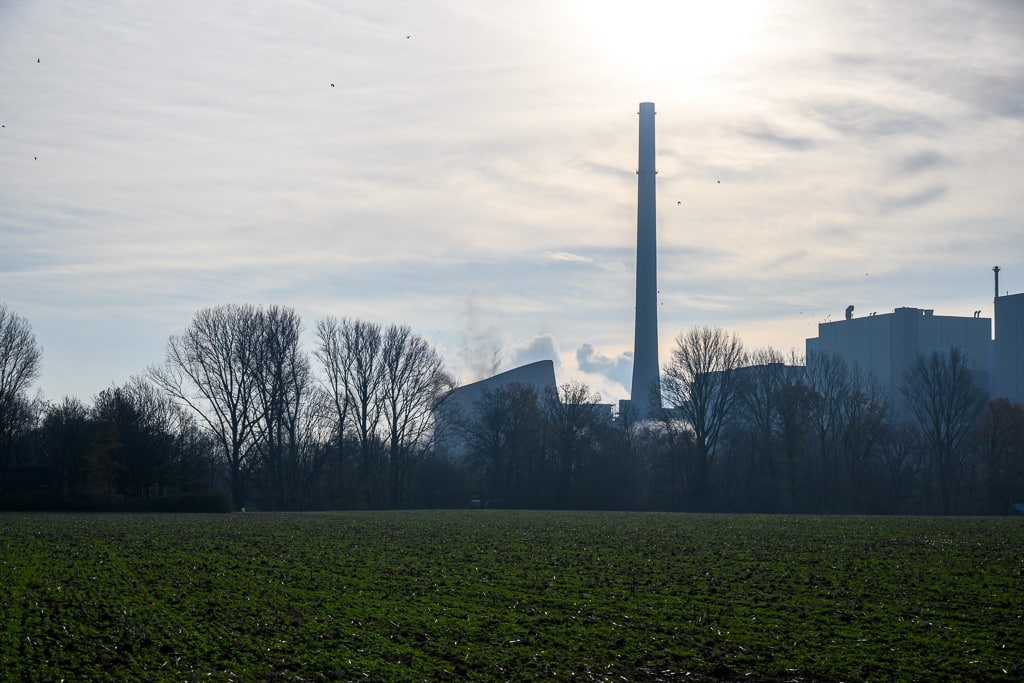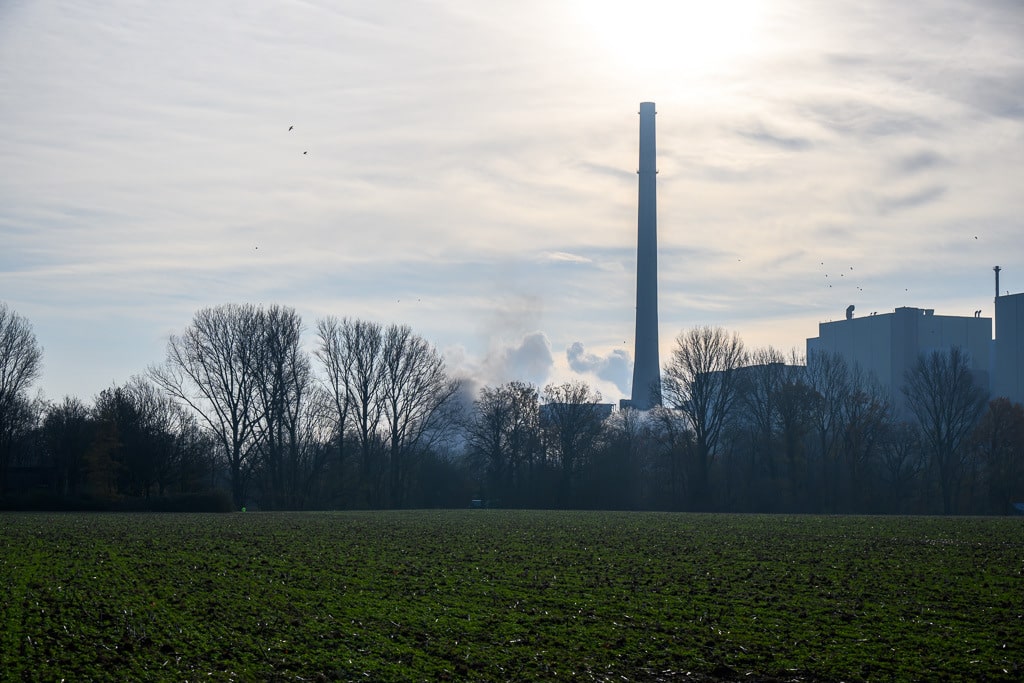 Kurz nach 9 Uhr erreichen wir den Parkplatz Strandhaus Ahr gegenüber dem namengebenden Strandhaus Ahr. Der Übergang von der Frankfurter Straße zur Ahrstrasse ist nicht gesperrt. Der Parkplatz ist so früh noch so gut wie leer. Wir begeben uns zu Fuß zurück zur Frankfurter Straße weiter zur Straße In den Eichen. Von dort haben wir geplant die Sprengung des Kühlturms im Kraftwerk Voerde zu dokumentieren. Als wir dort eintreffen ist nur ein Team vom WDR mit Kamera und Drohne schon vor Ort. Es herrscht fast so etwas wie Götterdämmerung.