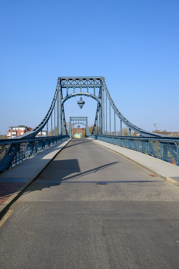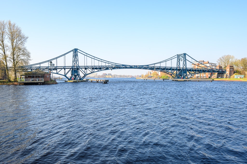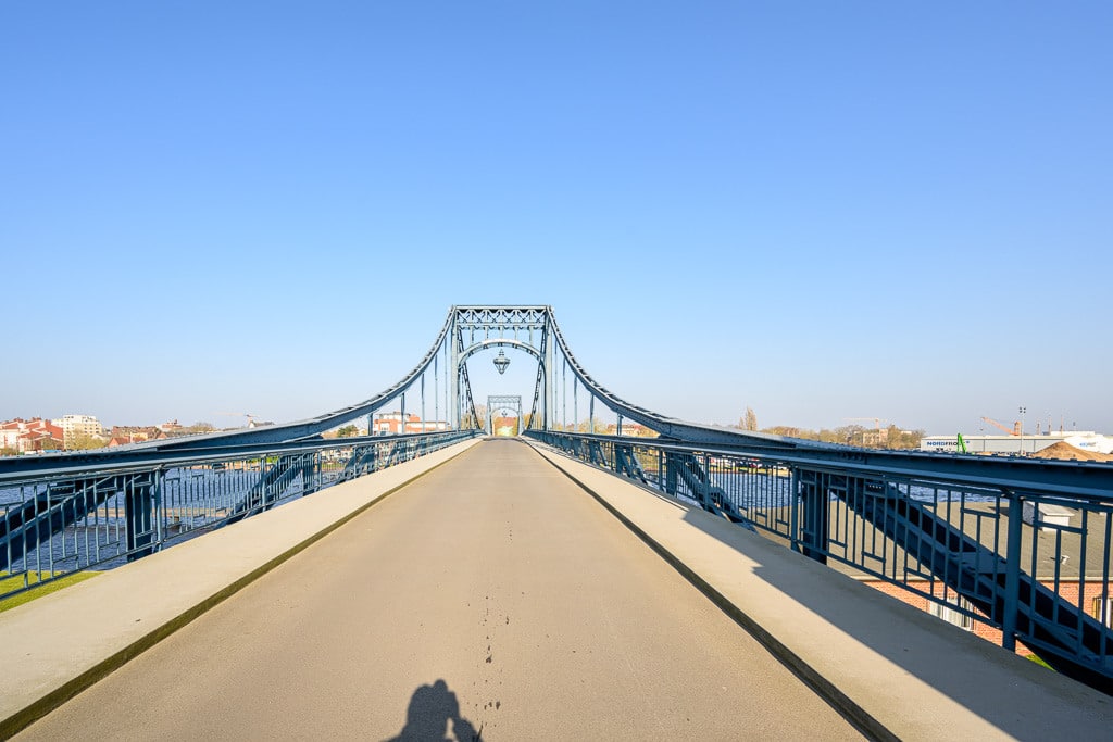 Die von 1905 bis 1907 erbaute 159 Meter lange Hängebrücke ist funktional eine Doppeldrehbrücke. Die Durchfahrtshöhe für die Schiffe beträgt je nach Wasserstand 9 bis 10 Meter, die Durchfahrtsbreite gute 58 Meter. Für den Autoverkehr ist die Brücke nur einspurig befahrbar. Die Verkehrsregelung übernimmt eine Ampelanlage. Fußgänger und Radfahrer können bei geschlossener Brücke immer passieren. Wir nutzen die Möglichkeit uns zwischen den Ampelphasen auch mal mitten auf die Fahrbahn zu stellen.