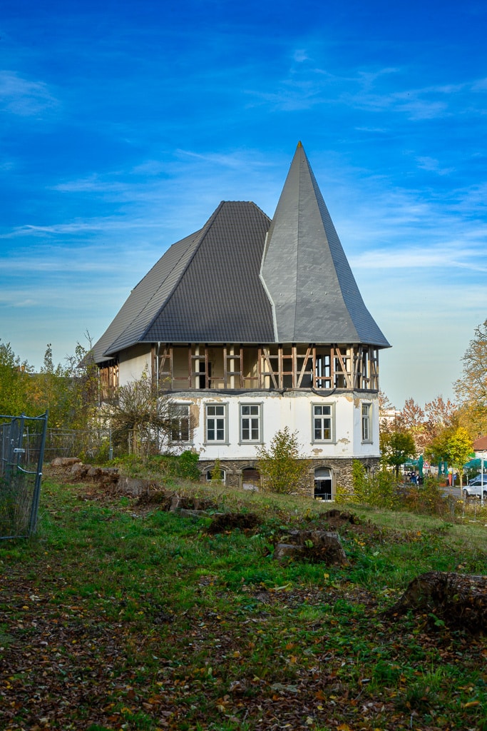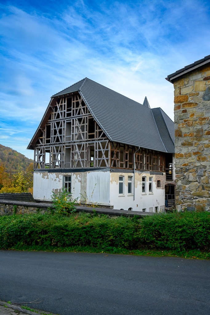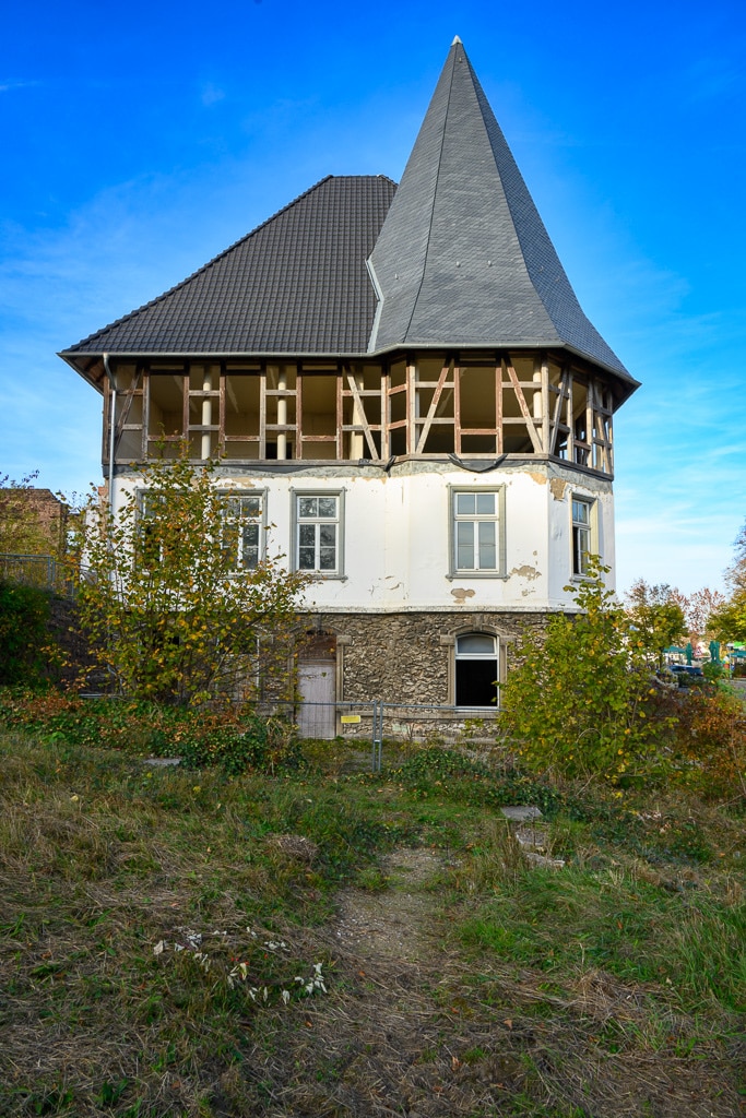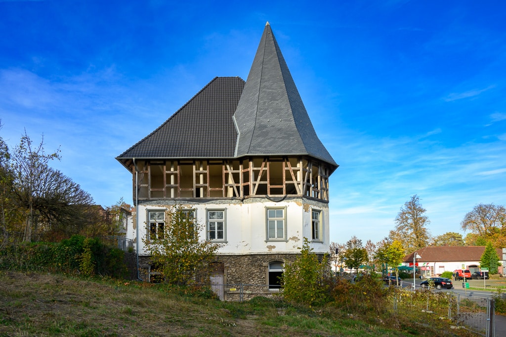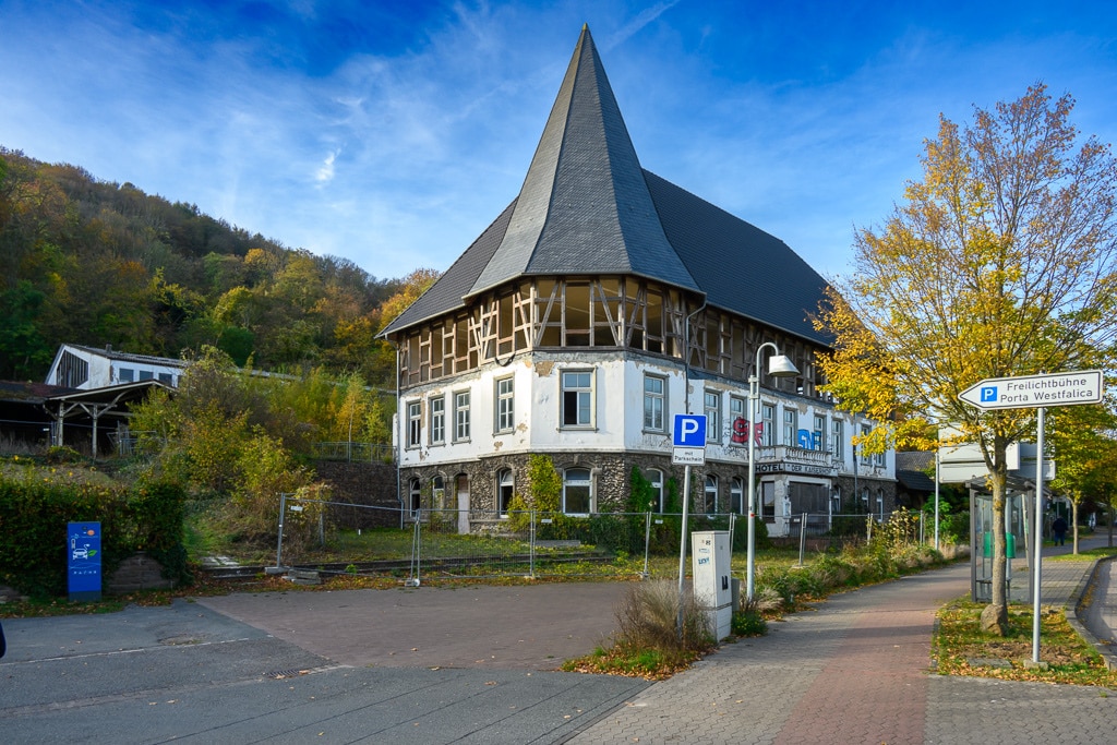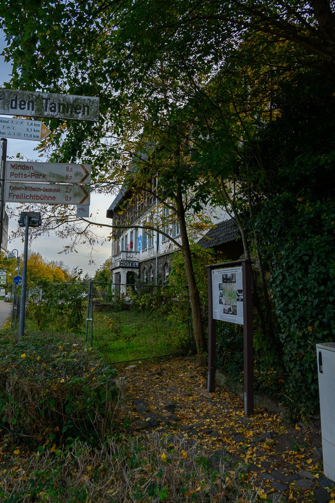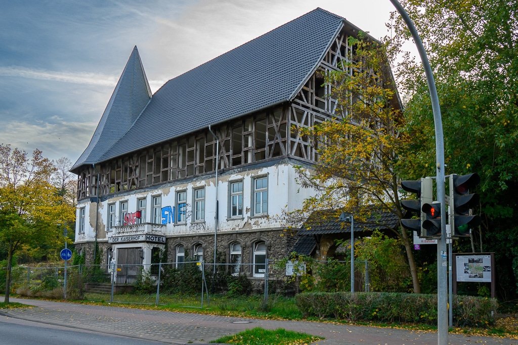 Graffiti, eine vernagelte Tür, darüber das Schild „Der Kaiserhof“ und im Obergeschoß sind nur noch die Balken des Fachwerks zu sehen. Auf dem Dach neue Ziegel? Wir sehen plötzlich ein Gebäude am Straßenrand, das zunächst wie ein typischer Lost Place aussieht. Eigentlich wollten wir wollten das Kaiser Wilhelm Denkmal besuchen.