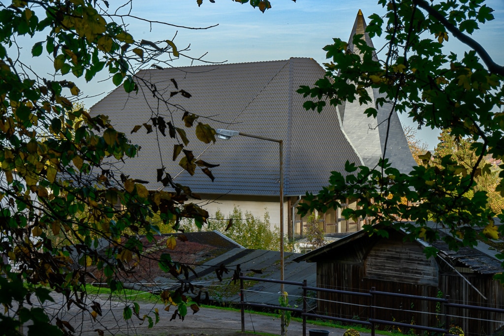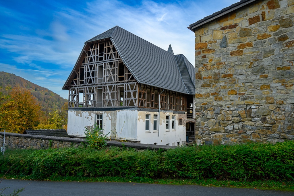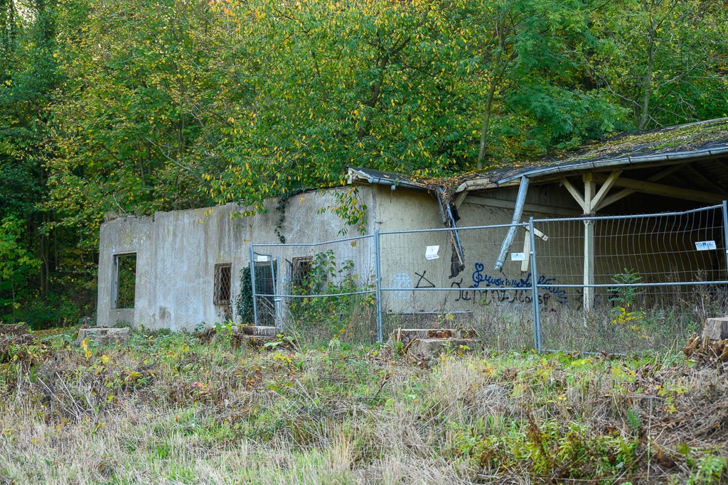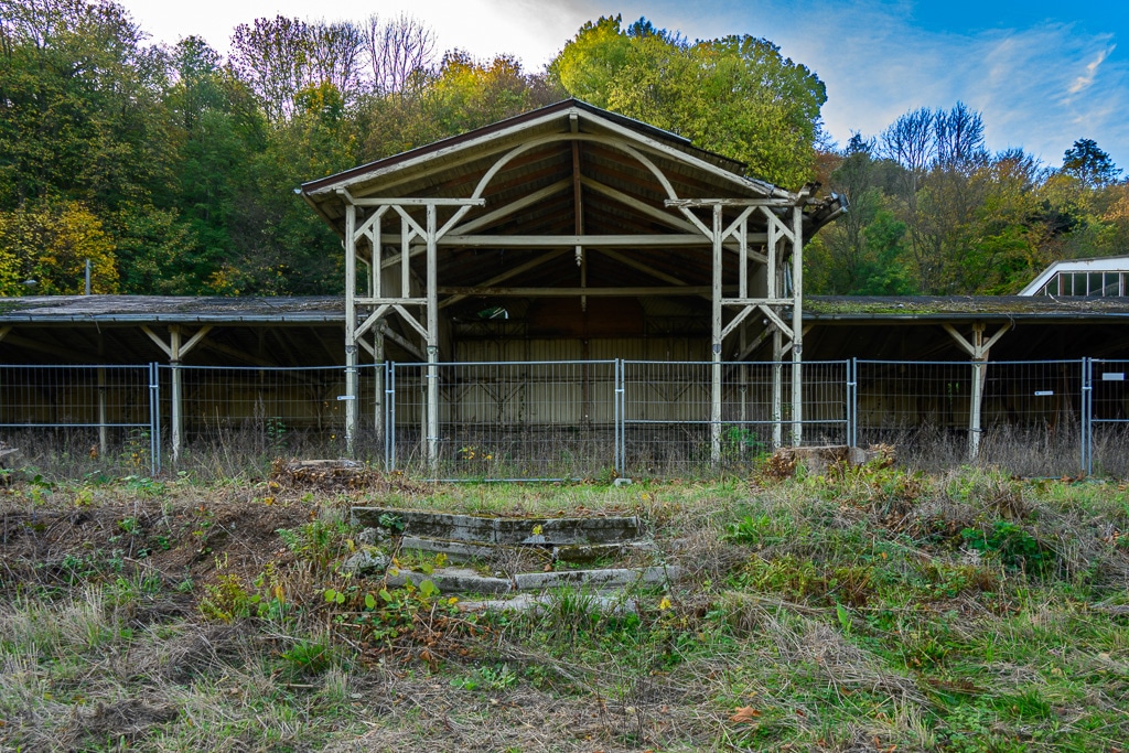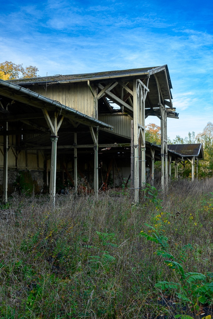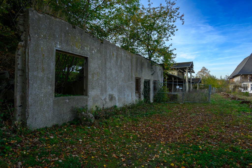 Wir parken das Auto und schauen uns das näher an. Was ist mit dem Dach? Das Dach sieht doch aus wie neu gedeckt. Und auf den zweiten Blick bestätigt sich das. Indess die Laubenhalle neben dem Hauptgebäude verstärkt den Eindruck, dass es sich doch um einen Lost Place handeln könnte. Was ist hier nur passiert? Ist es nun ein Lost Place oder doch nicht? Das müssen wir später untersuchen.