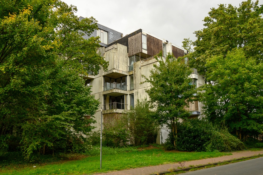 Fertiggestellt wurd das aus Fertigbauteilen errichtete Gebäude 1975. Es sollte Wandelbarkeit und freie Raumaufteilung symbolisieren und galt als zukunftsweisende Idee. 40 Wohnungen gruppieren sich um einen offenen Innenhof. Die Wohnungsgrundrisse waren veränderbar, durch verschiebbare Wände. Durch Ausklappen der Außenwände konnte der Balkon zum Wintergarten werden. Gerade diese Besonderheit und die mangelhafte Isolierung führten aber bald zu baukonstruktiven und bauphysikalischen Mängeln wie zum Beispiel Feuchtigkeitsschäden. Bauphysikalisch ist wohl alles schiefgegangen. Wegen der ständigen Feuchtigkeit bekam das Haus im Volksmund den Namen „Tropfsteinhöhle“