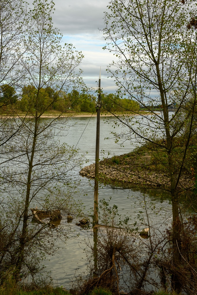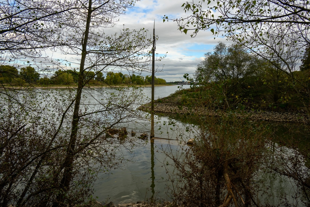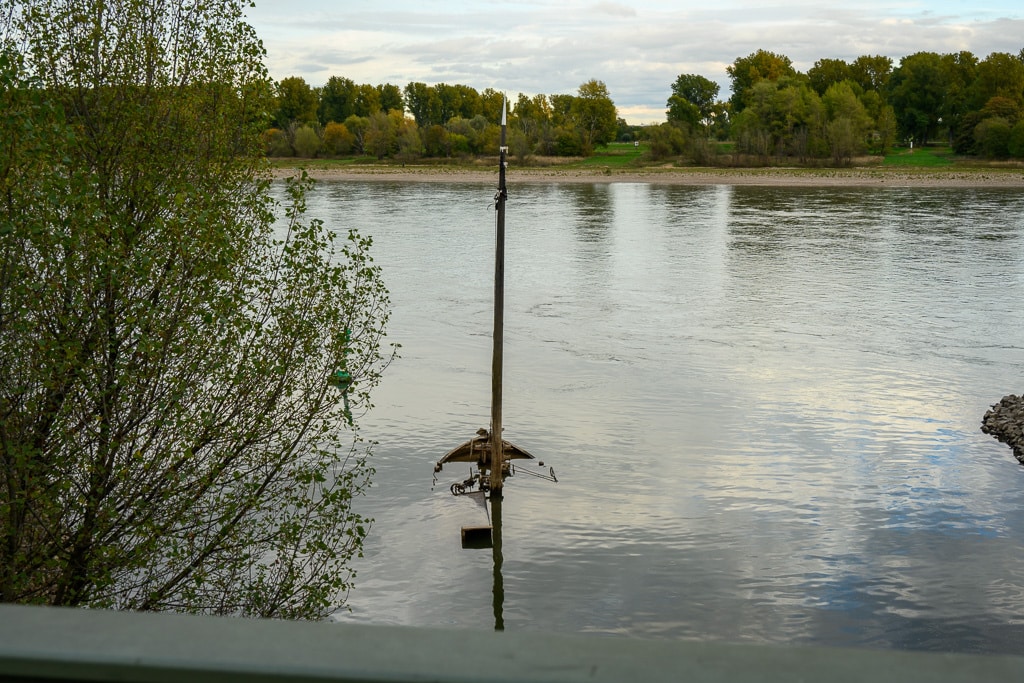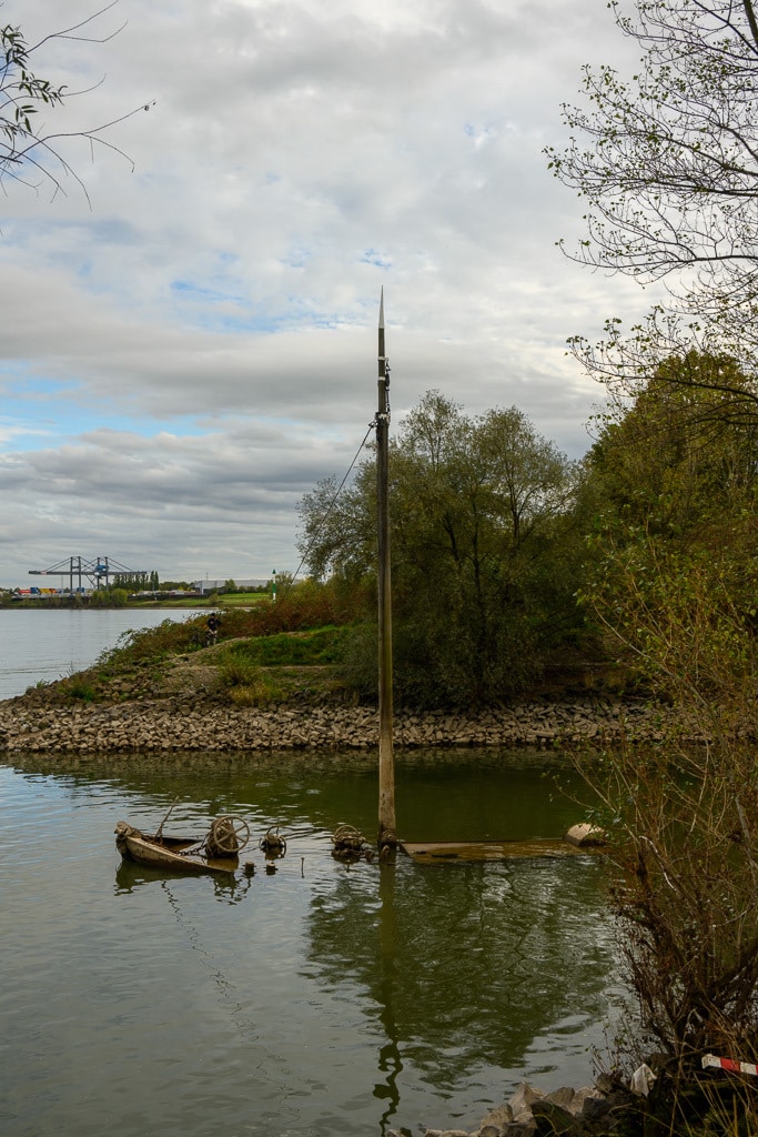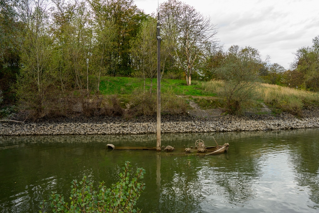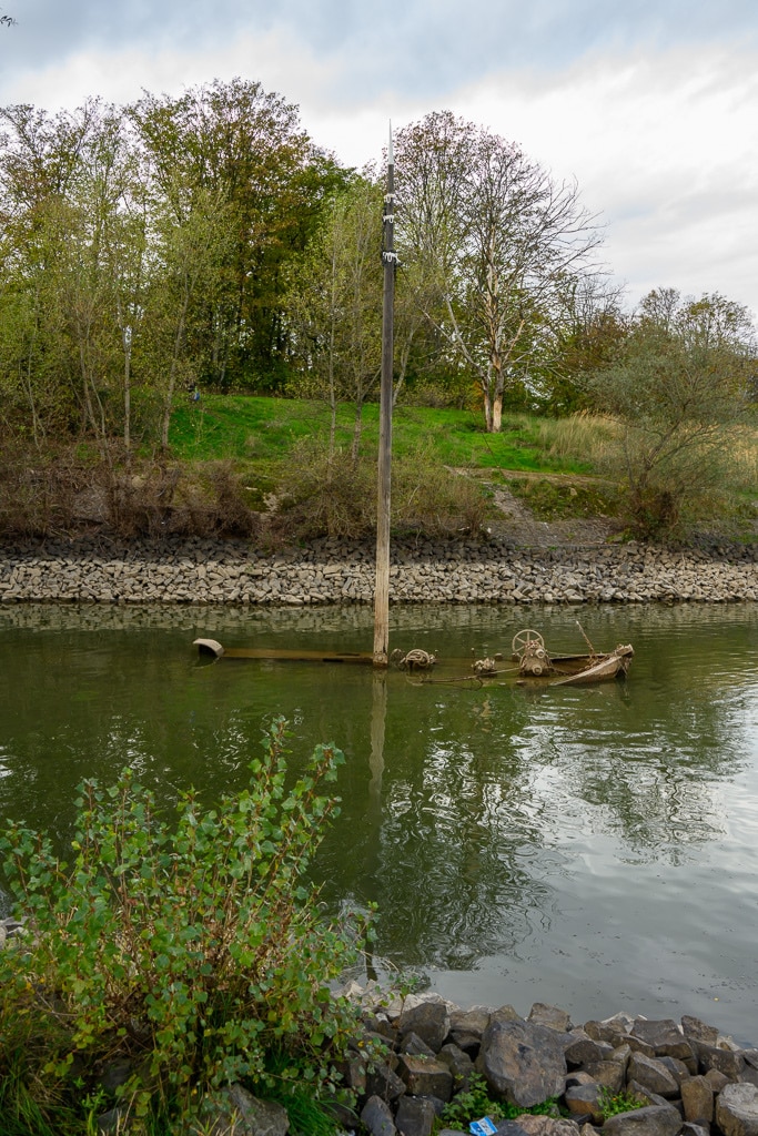 Wir gehen einen kleinen ausgetretenen Pfad, der an dieser Stelle von der B 9 hinunter an den Rhein führt, hinunter. Die Stelle wird von einigen Anglern genutzt, die hier nach Barschen, Rotaugen, Aalen und Welsen fischen. Ein wenig gruselig wirkt es schon auf uns, wie ein Geisterschiff, mit schlammüberzogenen Aufbauten. Die Räder der Winden sind trotzdem noch gut zu erkennen.