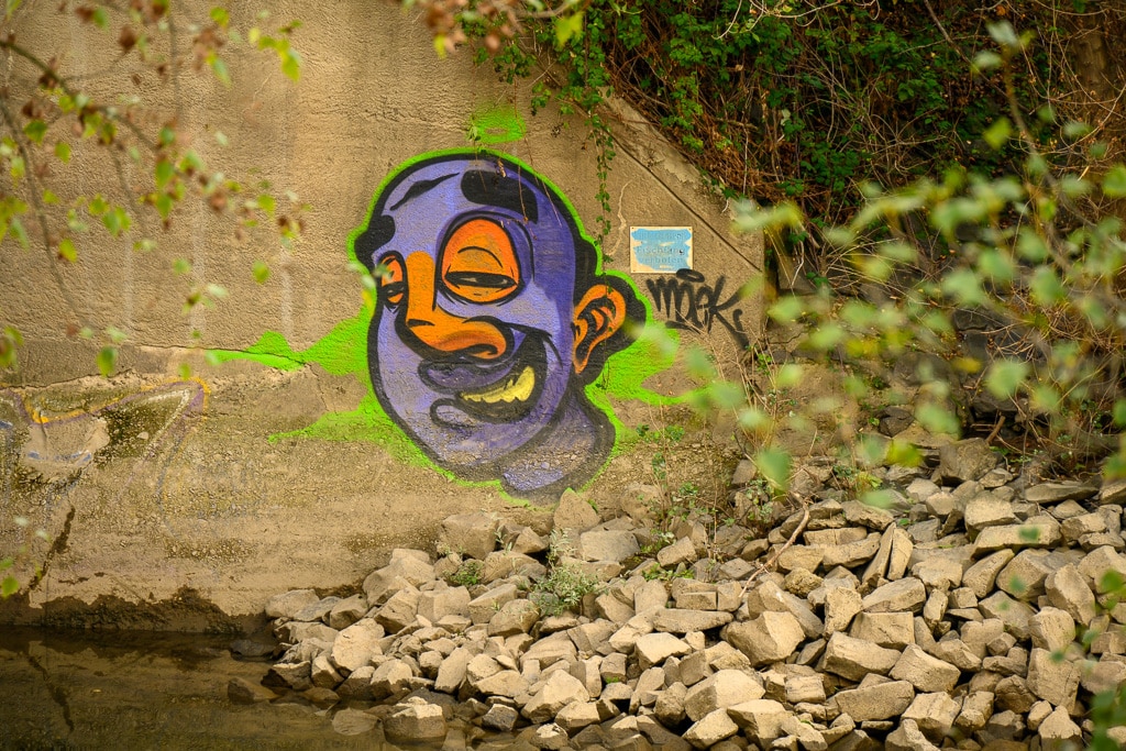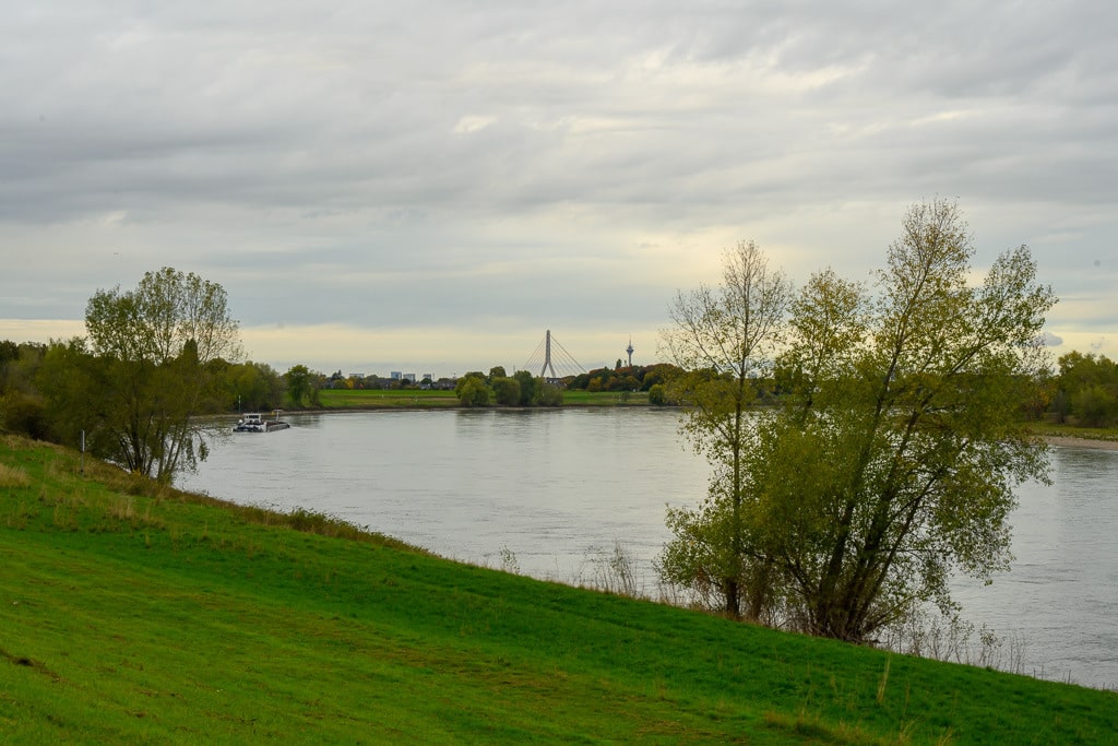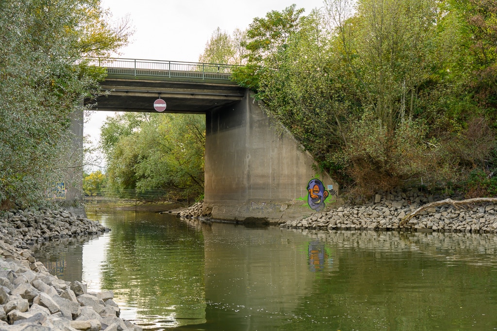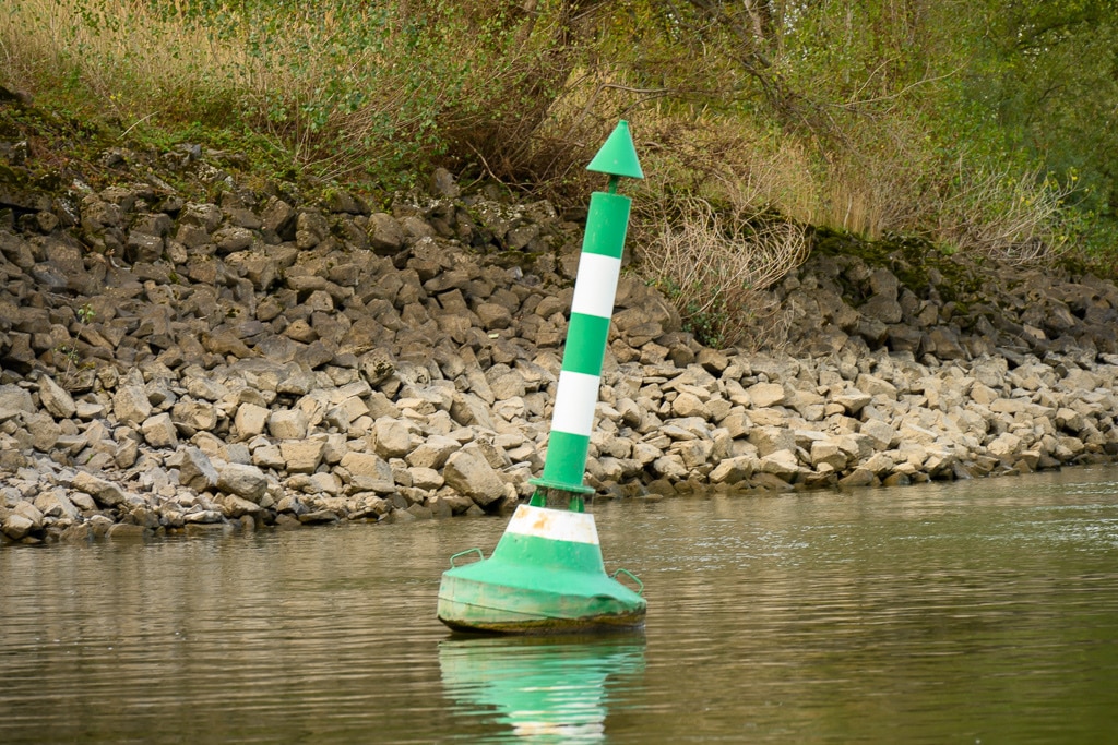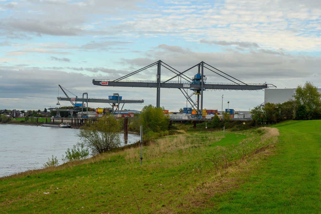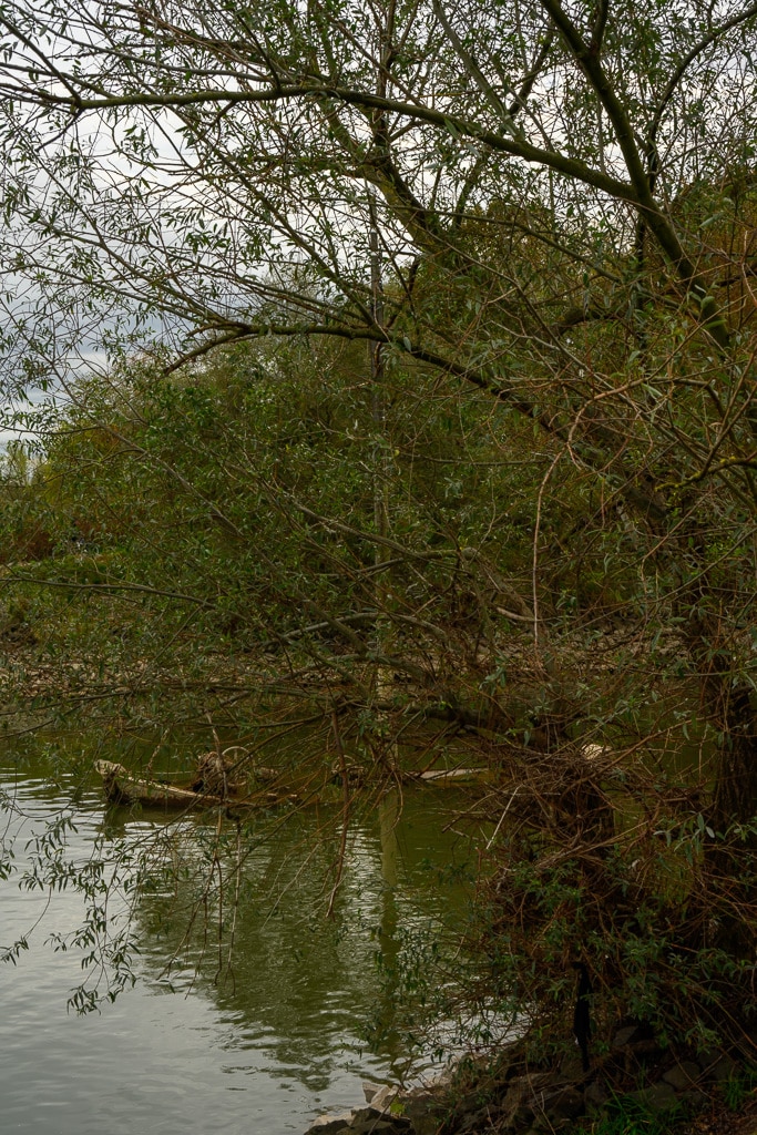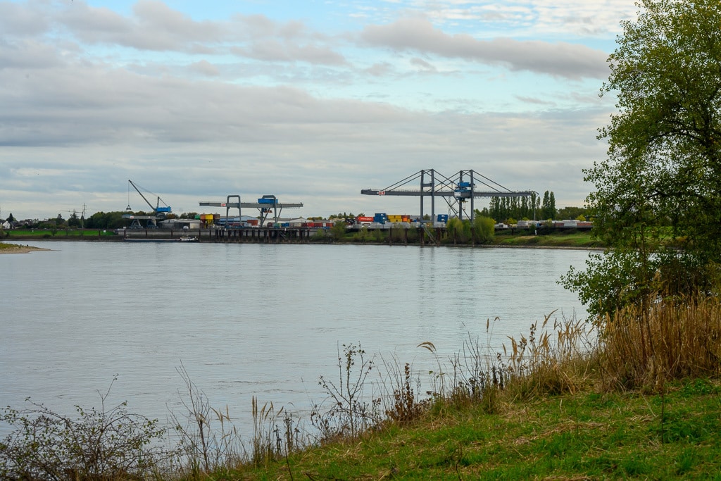 Wir gehen einen kleinen ausgetretenen Pfad, der an dieser Stelle von der B 9 hinunter an den Rhein führt, hinunter. Die Stelle wird von einigen Anglern genutzt, die hier nach Barschen, Rotaugen, Aalen und Welsen fischen. Ein wenig gruselig wirkt es schon auf uns, wie ein Geisterschiff, mit schlammüberzogenen Aufbauten. Die Räder der Winden sind trotzdem noch gut zu erkennen.