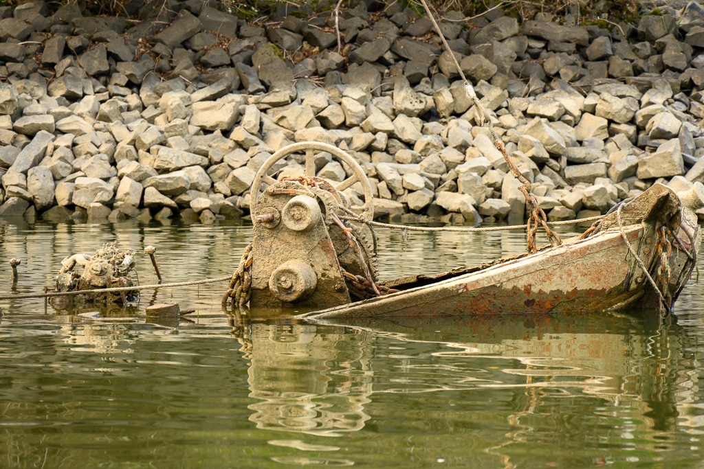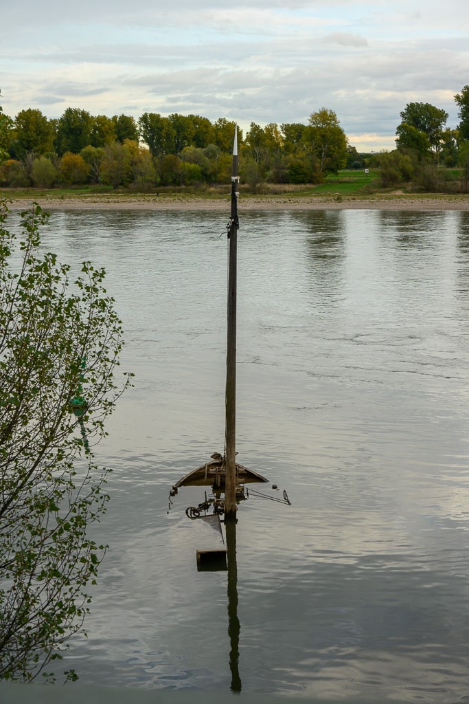Das Wrack des alten Aalschokkers, der in den 1990er-Jahren unterging, blieb lange Zeit weitgehend vom Fluss verschluckt. Zuletzt blicken ließ er sich im Jahr 2018, davor im Jahr 2003. Heute ist er aufgrund des Niedrigwassers wieder fast vollständig aufgetaucht.