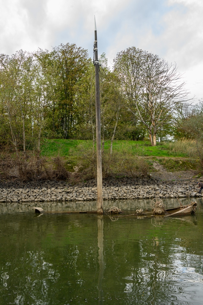Bei normalem Wasserstand ragt nur die Mastspitze des 1906 gebauten Aalschokkers aus den Fluten. Benannt wurde er nach der Insel Schokland in der Zuidersee (Niederlande). In diesen Gewässern wurde der Schiffstyp eingesetzt. Wie der Name verrät, wurden sogenannte Aalschokker insbesondere für den Aalfang gebaut.